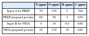 Table 1.Gas and carbon contents in two different ingots used in this study: PREP-prepared and VIGA-prepared superalloy powders