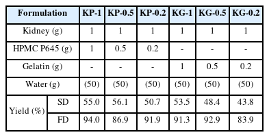 - 분쇄된 돼지 신장 시료는 정제수 40 mL에 일정량을 첨가 후 고속 균질기를 이용하여 11,000 rpm에서 10분간 균질화하였다. 균질화된 시료는 60 mesh 체(250 μm)를 통과시켜 체공보다 큰 입자를 제거하였다. 첨가제로 미리 준비된 합성 고분자인 HPMC P645 용액 또는 천연 유래 고분자인젤라틴 용액 10 mL을 사용하였으며, 균질화된 시료 대비 다양한 비율로 제조 후 투입하고 동시에 교반하였다(Table 1). 건조 공정은 분무건조(SD) 또는 동결건조(FD) 방식으로 수행하였다. 분무건조는 직경 711 μm의 Nozzle을 사용하였고, 주입구 온도 120°C, 배출구 온도 75~78°C, 분무공기 압력 0.1 MPa, 공급 유속 1.5 mL/min, blower 6.5 조건에서 실시하였다. 동결건조는 Ice condenser 온도 –70°C, 진공도(vacuum) 0.12 mbar 조건으로 24시간 동안 진행하였으며, 건조 완료 후 시료는 블렌더로 분쇄하여 분말 형태로 제조하였다. 제조된 각 시료는 건조 공정 방식과 첨가제 종류 및 비율에 따라 KP (Kidney + HPMC P645) 및 KG (Kidney + 젤라틴) 그룹으로 구분하여 관리하였으며, 각 조성 및 수득률은 Table 1에 정리하였다.