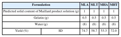 - 효소 가수분해를 거쳐 2.5%(w/v) xylose를 첨가 후 가열 반응을 마친 돼지 간 및 심장 유래 시료를 사용하였다. 젤라틴은 50°C로 가온된 정제수에 용해하여 용액으로 제조하였으며, 액상의 마이야르 반응물 내 예상 고형분 1 g당 1:0.5 (w/w) 비율에 해당하는 젤라틴 용액을 준비하였다. 본 연구에서 Predicted solid content는 배합 단계의 이론 고형분(%)을 의미하며, 액상 마이야르 반응물을 동결건조하여 수분을 제거한 뒤 잔존 고형분을 계량하고, 이를 총 원액으로 나누어 계산하였다. 젤라틴은 제조 용액 농도를 고형분 비율로 적용하였다. 젤라틴 용액을 마이야르 반응물에 첨가한 후 교반하여 균일하게 혼합하였다. 혼합 시료는 섹션 2.2에서 기술한 조건과 동일한 분무건조 공정을 적용하여 분말화하였다. 제조된 시료는 사용된 돼지 적내장 부위와 단백질 가수분해 효소의 종류에 따라 Liver-Alcalase 처리군(MLA), Liver-Trypsin 처리군(MLT), Heart-Alcalase 처리군(MHA), Heart-Trypsin 처리군(MHT)으로 구분하였다(Table 2).