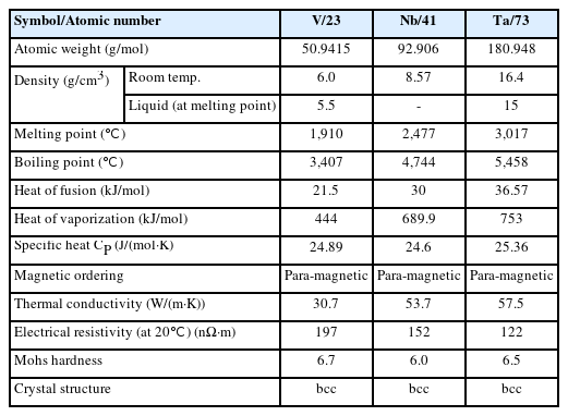 Table 1에는 Nb의 물리화학적 성질을 같은 족의 V, Ta과 비교하여 나타내었다. Nb은 광택이 있는 회색의 전성과 연성이 풍부한 금속이지만, 산화되면 산화수에 따라 노란색, 푸른색, 갈색, 보라색 등 다양한 색상을 나타낸다. Nb의 융점(2,477 ℃)은 Ta (3,017 ℃)보다 낮으나 V (1,910 ℃)보다 높으며, 밀도(8.57 g/cm3)가 Ta보다 낮으며, 내식성과 초전도체 특성을 가지고 있다. 특히 Nb은 철강과 비슷한 경도와 연전성을 가지고 있지만 철강에 소량만 첨가하여도 강도와 내열성이 향상되어 철강의 합금원소로 사용되고 있다. 본 논문에서는 이러한 Nb의 생산량, 용도와 함께 제련 및 리사이클링 현황에 관하여 고찰하였다.
