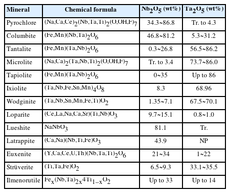 - Nb과 Ta은 같은 족으로 화학적 성질이나 원자의 이온 반경이 비슷하여 각각의 산화물이 결합된 형태나 다른 원소와 결합한 컬럼바이트(columbite), 탄탈라이트(tantalite) 등으로 존재한다[9]. Table 2에 주요 광물과 조성 범위를 나타내었으며[10], Nb과 Ta은 대부분 다양한 산화물 및 수산화물 광물에 존재하며, 경제적으로는 산화물이 중요 광물이지만 파이로클로르(pyrochlore)가 Nb 제품의 약 90 %를 차지하는 FeNb 제조에 사용되는 주된 광물이다. 그리고 열수광상의 일종인 컬럼바이트-탄탈라이트(columbite-tantalite), Nb과 Ta을 함유하는 주석광(cassiterite) 등이 있다. 컬럼바이트-탄탈라이트는 Nb 함량이 높으면 컬럼바이트, Ta 함량이 높으면 탄탈라이트로 부르며, 이들 두 원소의 함량이 비슷하면 탄탈로컬럼바이트라 부른다[9].