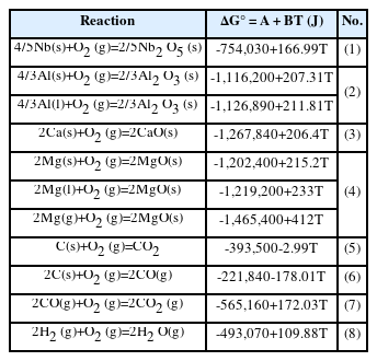 - Nb2O5의 환원제는 Nb보다 산소 친화력이 높으면서 Nb의 용해도가 낮고, 금속간화합물을 만들지 않으며, 탈산능이 커야 한다. 또 반응 생성물과 금속 Nb의 분리가 쉬워야 하고, 저렴하면서 친환경적인 상용 물질이어야 한다. 우선 산소 친화력과 관련하여 금속/산화물의 평형 관계는 다음 식으로 나타낼 수 있으며, Table 3에 Nb과 각 환원제의 산화반응에 관한 표준 자유에너지 변화를 나타내었다.