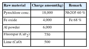 - FeNb(Nb 40~70 wt%)의 대부분은 파이로클로르(Nb 산화물)를 Al 열환원하여 만들며, Table 4에 브라질 CBMM사의 FeNb 제조(11 t/ch)를 위한 장입 원료량의 예를 나타내었다. 철분이 부족하면 산화철을 혼합하기도 하며, Nb2O5와 산화철의 Al 열환원 반응은 다음과 같이 발열반응이다[29].