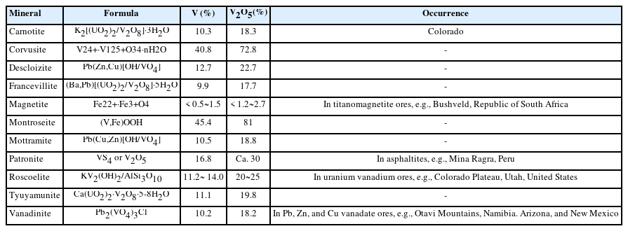 | Mineral | Formula | V (%) | V2O5(%) | Occurrence |