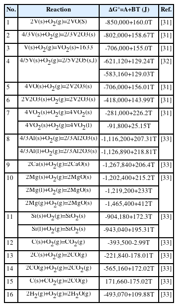 | 1 | 2V(s)+O2(g)=2VO(S) | -850,000+160.0T | [31] |